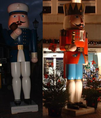 Dank der netten Belegschaft des ortsansässigen "Wäschehauses Reinbothe" wissen wir nun, dass wir in Leer den größten Räuchermann der Welt und einen 4 Meter großen Nussknacker verpasst haben. Beide befinden sich in der Altstadt und uns wurden sogar Fotos mitgeschickt, die wir euch natürlich nicht vorenthalten wollen. Links seht ihr den Räuchermann und rechts den Nussknacker.